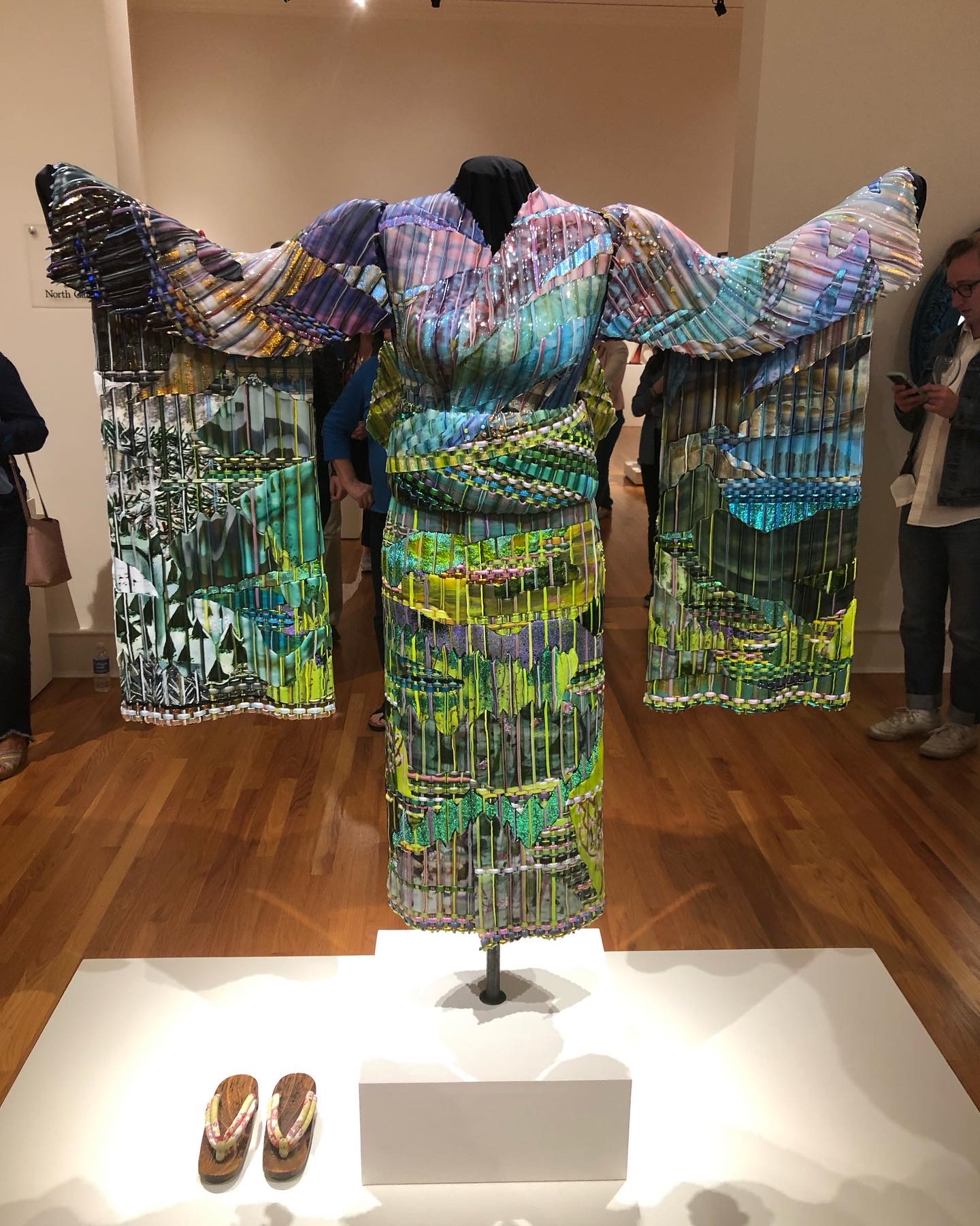 Woven glass, gold and silver foil, applied glass beads, wooden and fabric geta shoes, 2012